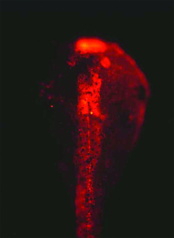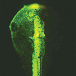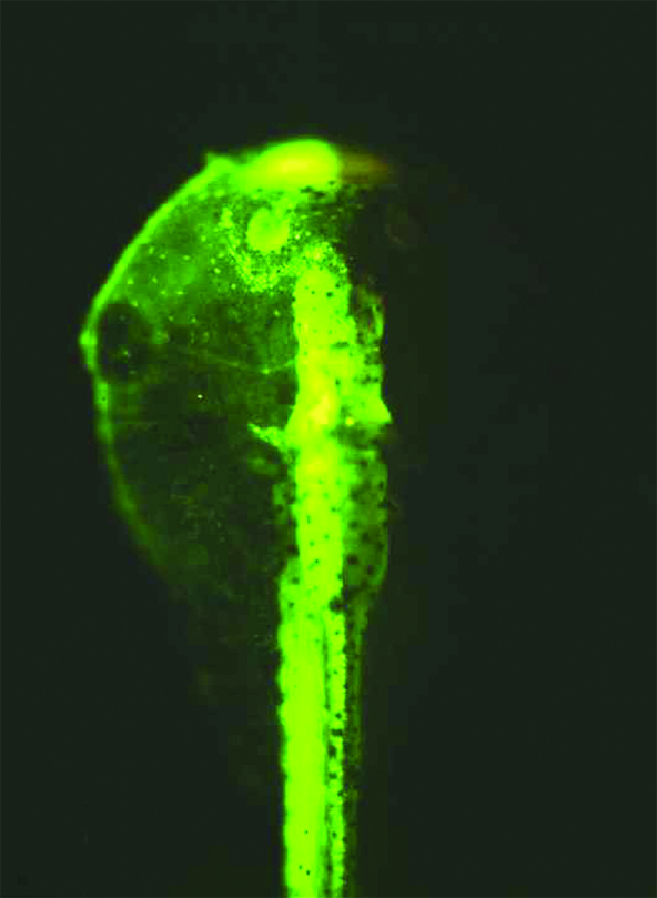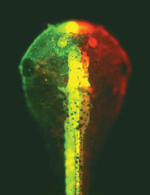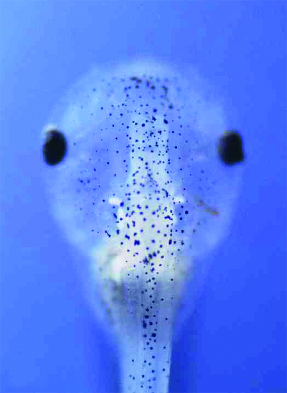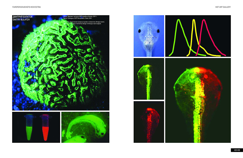 Transgenic tadpoles that glowed with genes from bioluminescent sea animals were created as a living artwork. Dmitry Bulatov, worked with a group of specialists from the D. Ivanovsky Institute of Virusology of the Academy of Sciences, to develop this chimeric organism based on aesthetic properties. After comparing the phosphorescing qualities of bacteria, jellyfish, and corals, the team decided to use the light-generating genes of the Pacifica actinia Anemonia Sulcata. These green-fluorescent protein (GFP) genes generated both red and green colors, which were microinjected into the genome of an aquatic frog (Xenopus laevis). The team was able to create tadpoles that glowed red and green, with one half of their bodies red and the other green. These new qualities were passed on to their offspring for several generations. However after about the fourth generation, the fluorescent qualities were lost and numerous developmental deviations and side effects were observed. In the words of the artist: “In 2004, our research group came to the conclusion that further experiments in artificially creating living objects with pre-designed esthetic properties were not feasible. The directors of the project decreed that all the organisms, which have undergone genetic manipulations, should remain within the experimental and exhibition area and by no means they should be allowed to penetrate the outside world.”