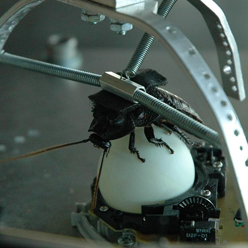 This studio project by Garnet Hertz is a critique of the field of biomimetic robotics and an exploration into the difference between biological organisms and computational systems. In this project, an actual insect controls the movement of a knee-height three-wheeled robot that is able to roam through a physical space. The insect sits on top of a modified computer trackball placed at the center of the machine, which operates like a two axis treadmill that controls the motion of the larger robot. The robot also features a navigation and sensor system to help the insect avoid smashing the robot into nearby objects. An array of distance sensors looks out in front of the robot. When an object is a few feet in front of the machine, the sensors detect the object and shine lights toward the insect from the direction of the obstacle. Since cockroaches tend to avoid light, the insect turns into the dark and steers the robot away from obstacles. While the cyborg-like machine is in operation, it highlights key characteristics of being biological, illustrating attributes like unpredictability, laziness, irrationality and emotional response. This project has had a deep impact on the field of robotic art, winning the XXV Oscar Signorini Prize (Milan, Italy) and Honorable Mention at the Vida 9.0 Art & Artificial Life International Competition (Madrid, Spain). It has been featured on the front page of the New York Times, and in numerous publications, documentaries and interviews including ORF Radio (Vienna), Arte (Paris), Countdown with Keith Olbermann, NPR, Wired, Associated Press, TV Tokyo, Science Channel, and The Discovery Channel. Its extensive nine year exhibition history includes shows in Russia, Ireland, USA, Canada, and Austria, with appearances at SIGGRAPH, STRP Festival, Ars Electronica, Machine Project, Beall Center for Art & Technology, InterAccess and Art Moscow. For more information on the project, see http://conceptlab.com/roachbot/